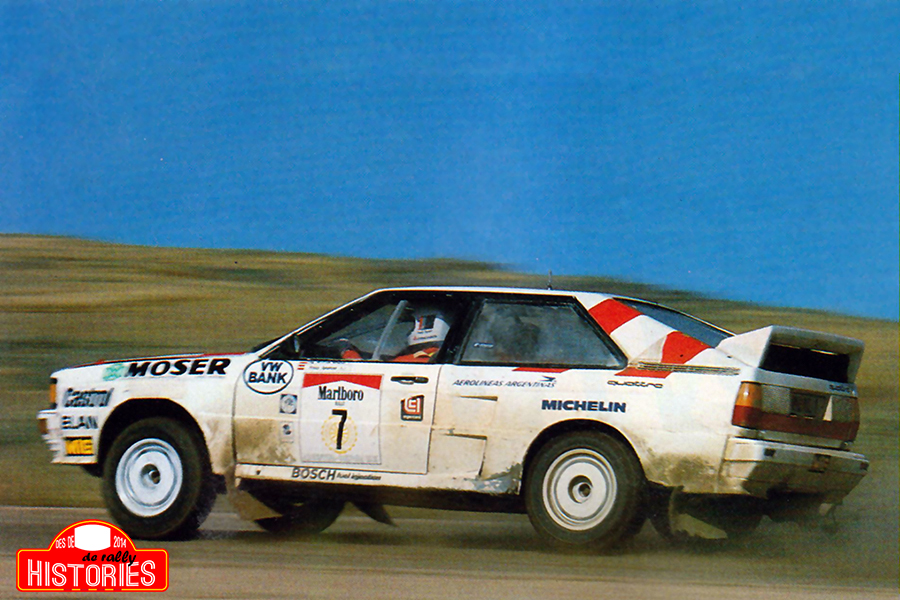 Wiedner-Zehetner salvaven els mobles d'Audi amb el seu primer podi al mundial. A les 10 en punt de la nit del dimarts 30 de juliol, els participants iniciaven des de Buenos Aires, el llarg, feixuc i absurd tram d’enllaç de més de 700 km fins a l’epicentre de la competició, la província de Córdoba, on els primers participants hi farien cap a primera hora del matí de l’endemà dimecres 31. Un cop a lloc, els organitzadors disposaven les 4 primeres proves especials als participants, llur corda total cronometrada assolia els 173,36 km. Ari Vatanen i Terry Harryman s’imposaven en la primera prova especial del programa amb una velocitat promig de 130,49 km/h i per un avenç d’1 segon vers el registre dels seus companys Timo Salonen i Seppo Harjanne, així com el dels guanyadors de la darrera edició de la ronda argentina, Stig Blomqvist i Björn Cederberg, qui hi feien debutar el flamant Audi Sport Quattro E2. La lluita era molt tancada i les ombres es cenyien sobre els líders provisionals en la següent especial programada, Las Bajadas, en la que els pilots, mentre afrontaven una llarga recta a uns 190 km/h, es veien sorpresos per un petit sotrac de la pista i sortien despedits de la traçada, donant fins a 4 voltes de campana i anant a aturar-se a uns 160 metres del lloc de l’accident. El Peugeot 205 T16 que pilotaven quedava per la ferralla i afortunadament per al finlandès i el britànic, els pilots eren evacuats d’immediat per helicòpter de l’equip fins a l’Hospital de Rio Tercero, on els metges van poder controlar l'hemorràgia interna que hagués pogut acabar amb la vida del de Tuupovaara. La resta de participants que afrontaven el lloc de l’accident a continuació, rodejaven l’esvoranc per la seva dreta i evitaven així el potencial perill d’aquest. Timo Salonen i Seppo Harjanne hi aconseguien el millor temps i els finlandesos es feien amb el lideratge de la taula provisional, seguits de la tercera parella de la casa del lleó, l’ex pilot de Fórmula 1 argentí Carlos Reutemann i el francès Jean-François Fauchille, així com d’Stig Blomqvist i Björn Cederberg, qui en un dels diversos guals de l’especial, s’hi deixaven un grapat de segons en entrar aigua en el motor, a part de perdre-hi l’ala anterior, el que els hi provocava problemes de subviratge. La igualtat entre Timo Salonen i Seppo Harjanne amb Stig Blomqvist i Björn Cederberg retornava en la recta final de l’etapa, i marcant cronos molt similars, els finlandesos de Peugeot s’imposaven en la tercera prova especial de l’etapa i els suecs d’Audi en la quarta, la més llarga de tota la jornada amb 71,12 km de corda, tots dos equips feien cap al parc tancat ocupant les dues primeres posicions. Mentrestant, descontents amb la seva posada a punt de les suspensions, Carlos Reutemann i Jean-François Fauchille perdien el contacte amb els pilots capdavanters i quedaven fora de les posicions de podi. Superats els 173,36 km cronometrats de la primera etapa, les 101 parelles participants que restaven en actiu començaven a endinsar-se en el parc tancat de Córdoba quan encara mancaven 3 minuts per a 3 quarts de 3 de la tarda. Timo Salonen i Seppo Harjanne hi feien entrada en primera posició i per 2 minuts i 41 segons de marge en relació a Stig Blomqvist i Björn Cederberg, mentre que els austríacs Wilfried Wiedner i Franz Zehetner eren tercers a 6 minuts i 34 segons dels líders, precedint en 23 segons a Carlos Reutemann i Jean-François Fauchille. Privats de 4 rodes motrius, així com d’extenses jornades d’entrenament, Shekhar Mehta i Yvonne Mehta tancaven la pinça dels 5 primers classificats a 12 minuts i 58 segons dels líders. A les 6 en punt del matí del dijous 1 d’agost arrancava la segona etapa del ral·li, amb la sortida de la primera parella participant del parc tancat. 7 proves especials cronometrades es programaven al llarg de la jornada, un escull que finalitzaria per als més matiners de tots en passar 6 minuts de les 5 de la tarda del mateix dia i llur corda competitiva arribava fins als 319,93 km, la més longeva per a una etapa en l’itinerari, unes cronometrades que suposaven una incursió per la regió més septentrional de la província. Tal i com acabava la primera etapa, arrancava la segona, és a dir amb repartiment de victòries de tram entre els suecs de la firma bavaresa i els finlandesos de la borgonyona, mentre que en la tercera, “El Manzano”, s’hi produïa una de les altres imatges icòniques de l’edició. Timo Salonen i Seppo Harjanne patien una punxada i s’hagueren d’aturar a canviar la roda. Just en el moment de reincorporar-se a pista, arribaven per darrera Stig Blomqvist i Björn Cederberg, qui buscaven desesperadament superar als seus rivals finlandesos, que anaven més lents que ells. Finalment, veient que aquests no els hi deixaven pas i que el seu cotxe s’estava emportant tots els cops de les pedres que els seus oponents desprenien, els campions del món en vigència decidien afluixar i deixar un marge de seguretat d’uns 300 metres.